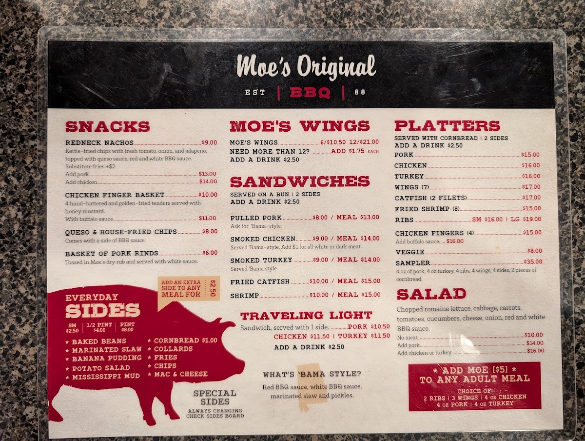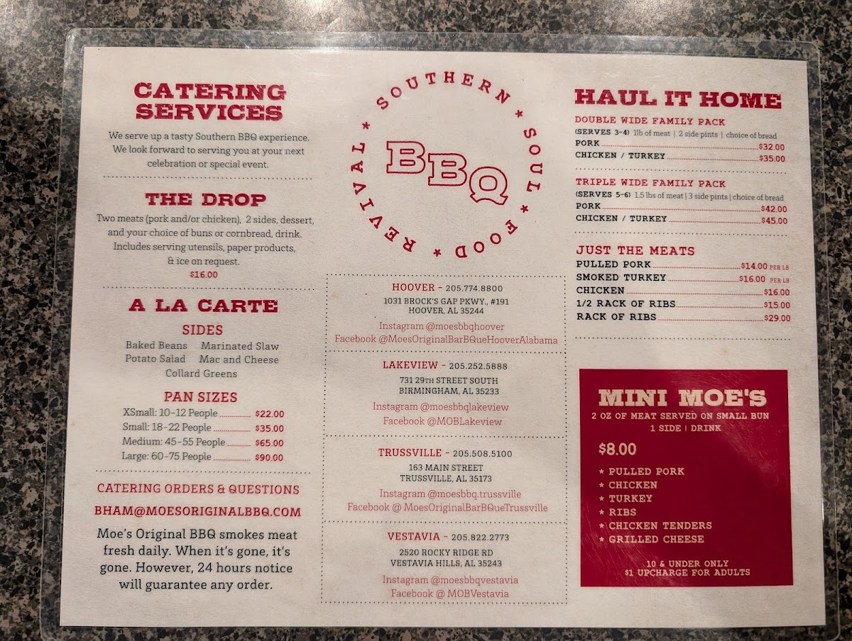 From a reviewer’s perspective, the menu at Moe’s Original BBQ in Vestavia Hills delivers a well-rounded and satisfying snapshot of classic Southern barbecue, wrapped in a casual, comfort-driven dining experience. As a conclusion to the menu overview, what stands out most is how thoughtfully the offerings are structured to serve every kind of diner-from snackers and solo guests to families and groups looking to take a full barbecue feast home.