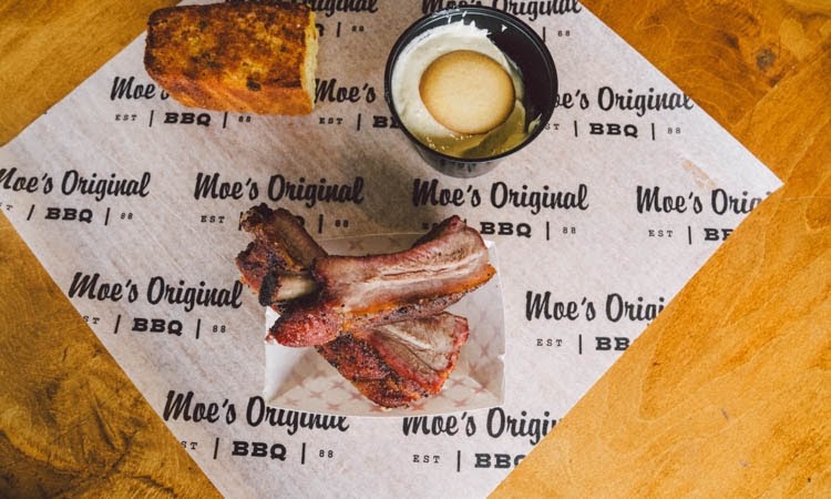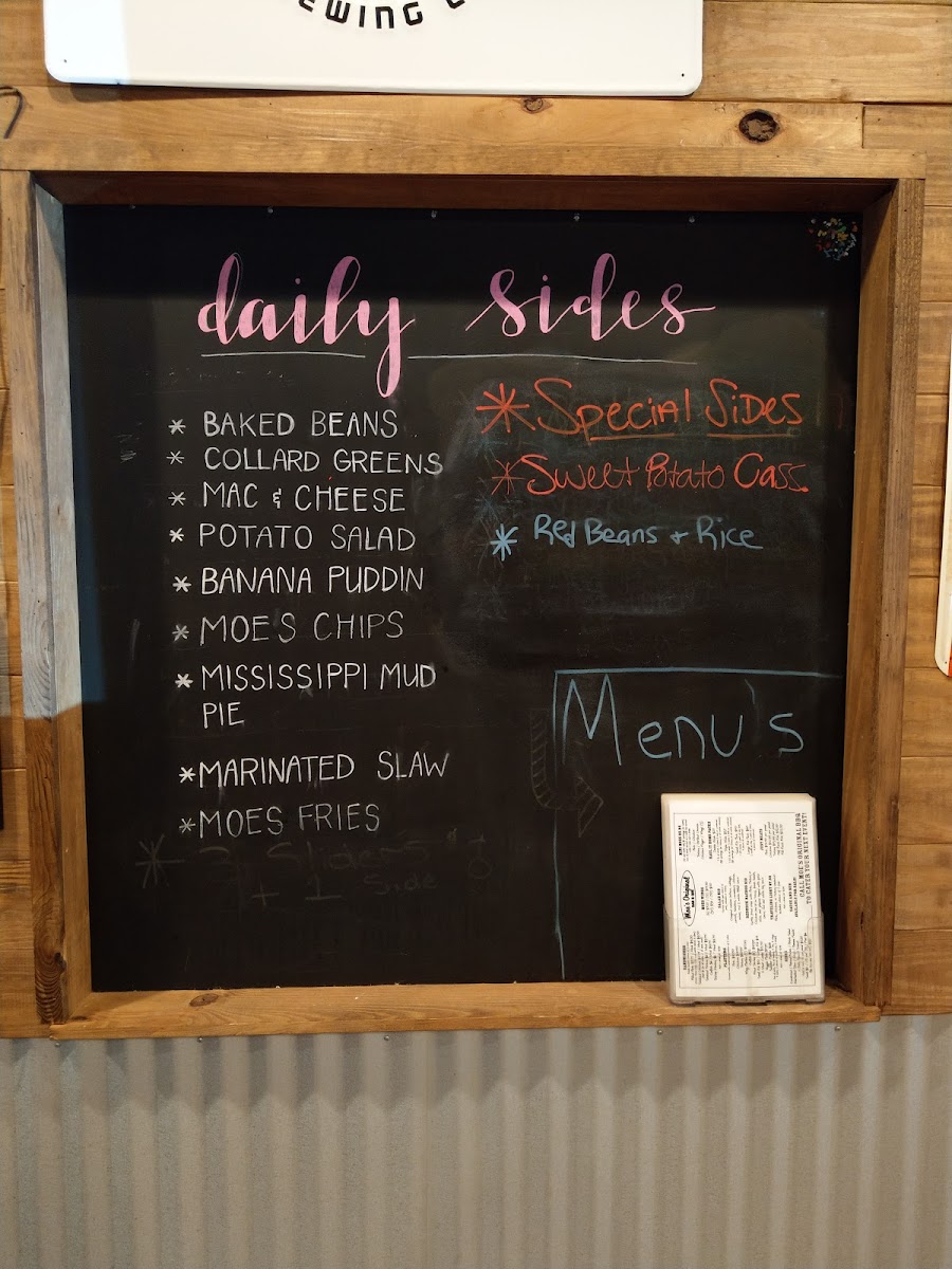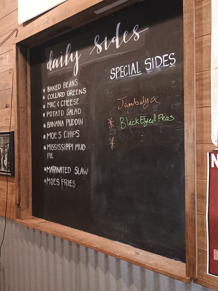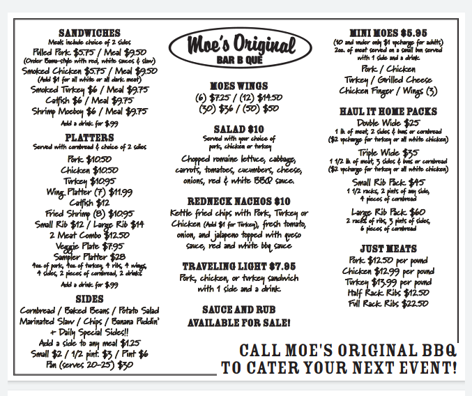 What truly elevates the menu is its flexibility. Larger orders such as the Double Wide Pork, Double Wide Chicken, Double Wide Turkey, Triple Wide Pork, and Triple Wide Chicken are perfect for sharing at home, while meat-only options like the Half Pound Of Pulled Pork, Pound Of Pulled Pork, Half Smoked Chicken, Whole Smoked Chicken, and Half Pound Of Smoked Turkey cater to true barbecue purists. Rounding everything out are simple sides and add-ons, including the classic $1 Cornbread, Small Side, 1/2 Pint Side, Pint Side, and Drink. Altogether, Moe’s Original BBQ menu feels complete, comforting, and confidently Southern-a fitting conclusion to a satisfying barbecue experience.